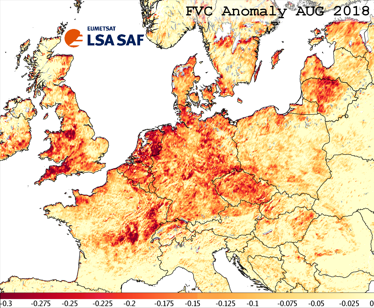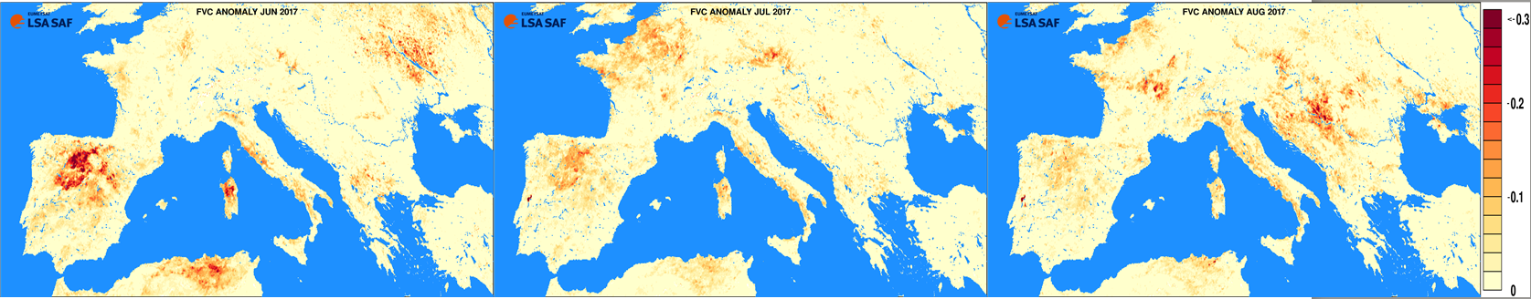 Fraction of vegetation cover (FVC) represents the fraction of green vegetation covering a unit area and is very helpful for monitoring the current state of vegetation. LSA SAF FVC over Europe in summer 2017 is shown together with differences from the reference state of vegetation over the same summer period...