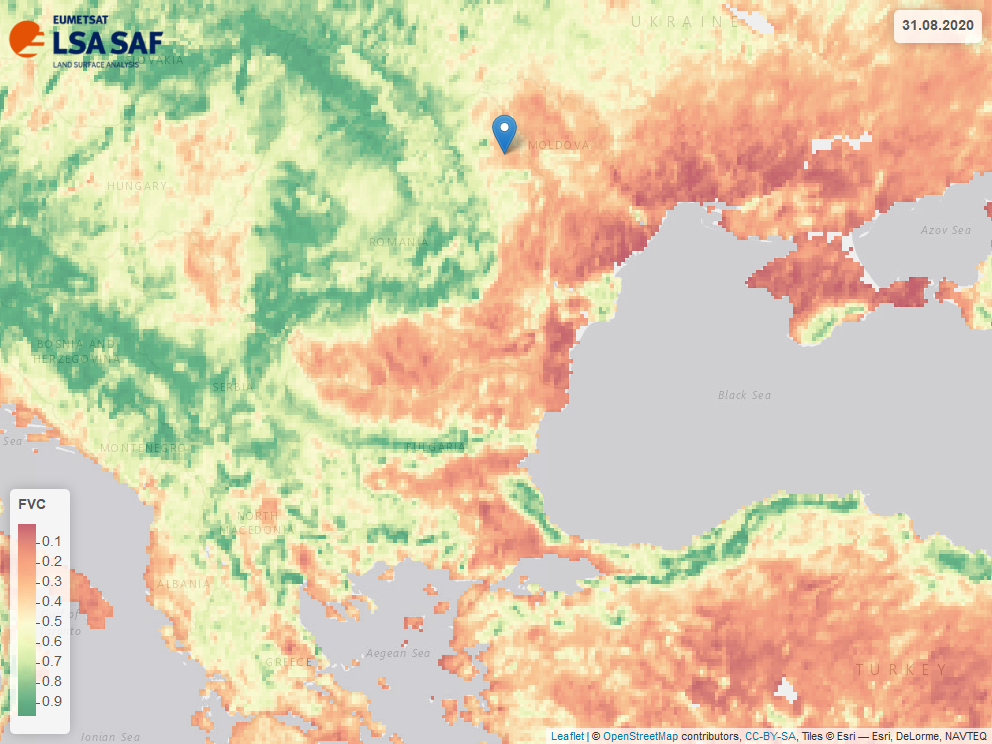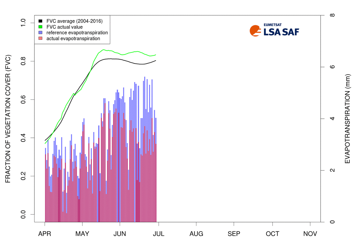 Fraction of vegetation cover (FVC, LSA-421;) is a vegetation product based on multi-channel remote sensing measurements derived from Meteosat geostationary satellite. It gives information on the fraction of ground unit area covered by green vegetation, which is relevant for applications in agriculture, forestry, environmental management and land use. It has also proved to be useful for drought monitoring.