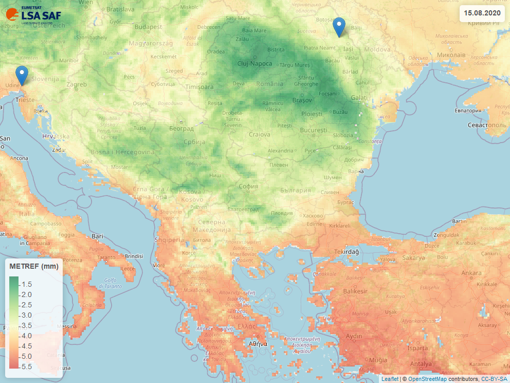 Evapotranspiration plays a crucial role in the recycling of precipitation, in soil water availability and consequently on food production. It depends mainly on the solar energy available to vaporize the water, on water content in the soil layers and on land cover types (like vegetation, open water, bare soil, etc.).