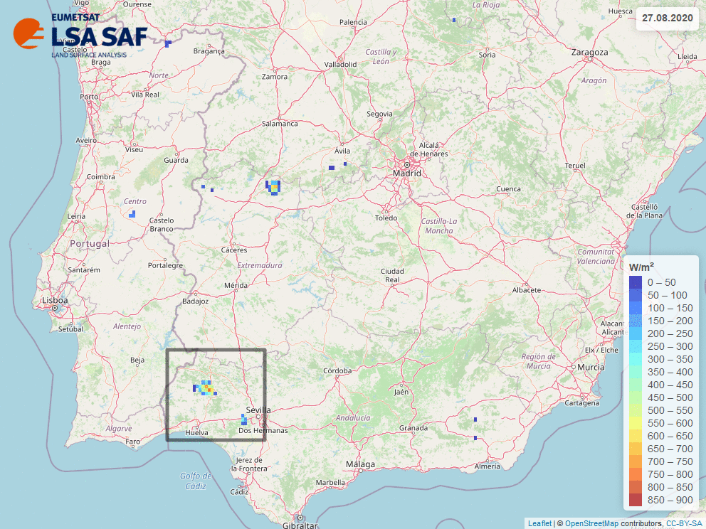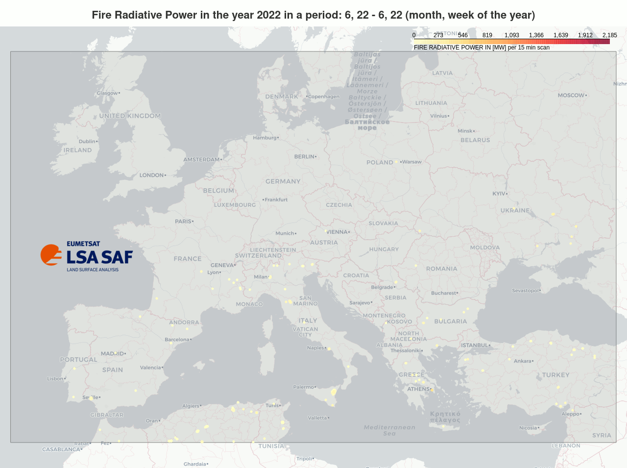 Values based on the Fire Radiative Power - Pixel Product (FRP-Pixel) delivered by LSA SAF.