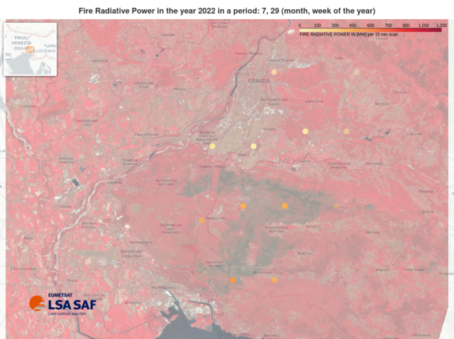 After a long and pronounced dry period, the Kras border region in SW Slovenia and NE Italy experienced summer conditions that favoured the ignition of larger fires. The largest wildfire in Slovenia in recent decades broke out in mid-July 2022. We analysed the evolution of the wildfire and its radiative power using the LSA SAF Fire Radiative Power Pixel (LSA SAF FRP, LSA-502) fire product derived from MSG/SEVIRI.
