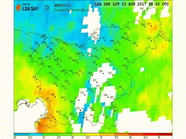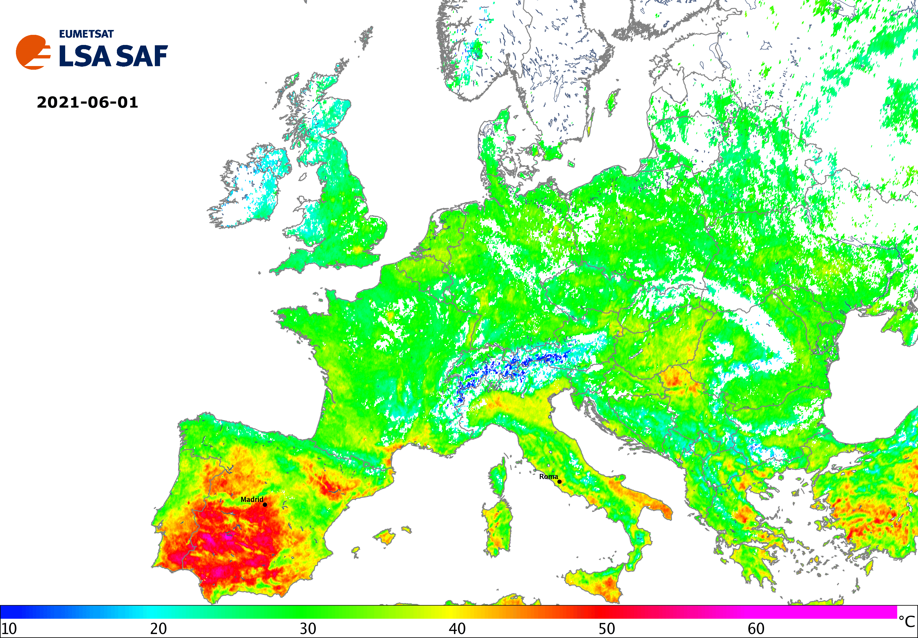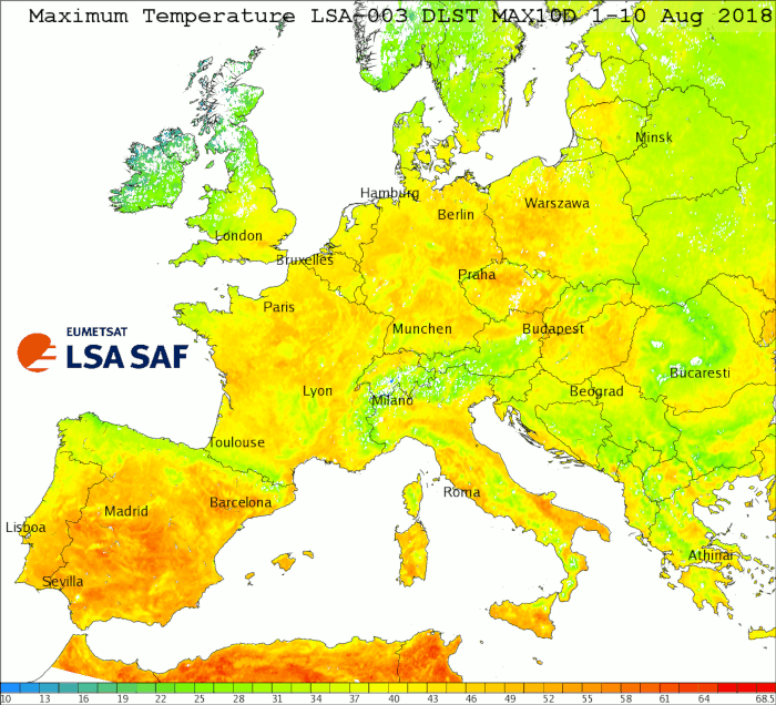 In the first half of August 2020 a second heatwave hit north-western Europe, which was caused by a hot air mass intrusion from Africa. LSA SAF Derived Land Surface Temperature (DLST; LSA-003) products are obtained from all available 15 minute Meteosat LST within a 10 day period. The DLST include Maximum LST composites and so-called Thermal Surface Parameters (TSP), which further summarize the information contained in the composites.