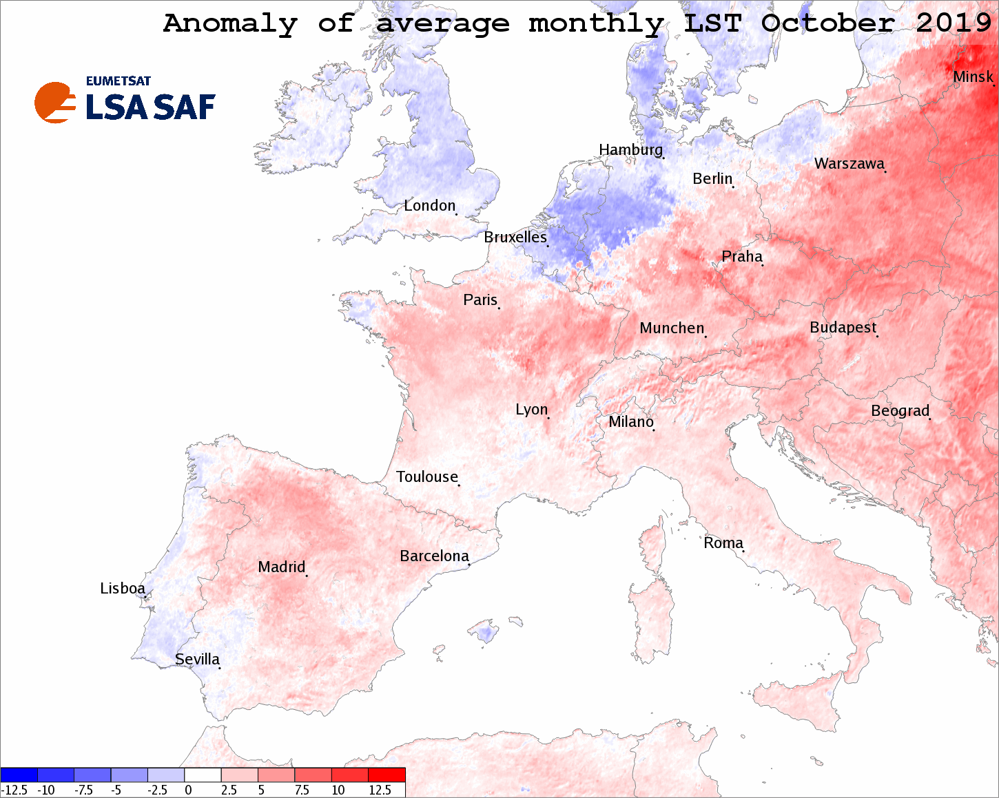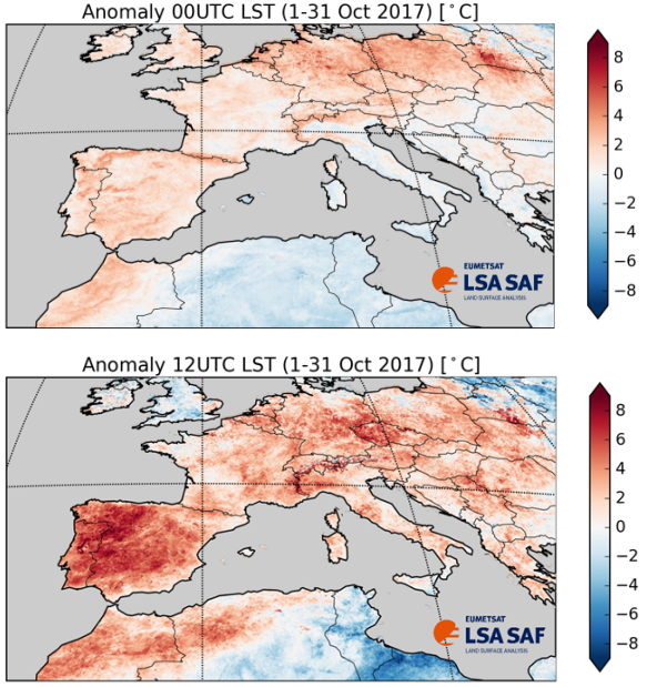 Central Europe felt an intense heatwave at the end of June. The animation shows the daily maximum land surface temperature anomalies for the time period between 24 of June and 2 of July 2019. The reference period is taken here as the 2004-2018 median.