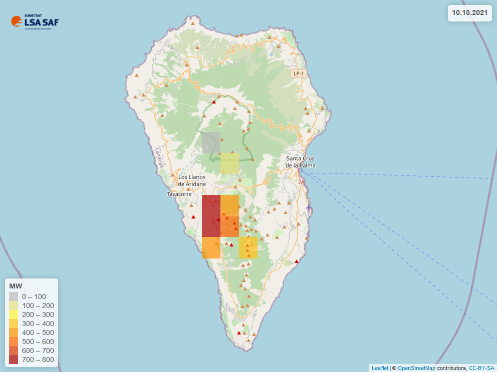 In the northwestern Canary island of La Palma, a volcanic eruption has started at the Cumbre Vieja volcano ridge on the 19th of September of 2021 after being inactive for over 50 years. It is the 8th recorded series of historical eruptions of Cumbre Vieja volcano. The volcano eruption lasted 85 days and ejected more than 107 m3 of material. Radiative power rise due to lava flow can be detected from various satellites. LSA SAF fire radiative power pixel (FRP-PIXEL: LSA-502) product is developed to detect high radiative disturbances every 15 minutes using Meteosat satellite.