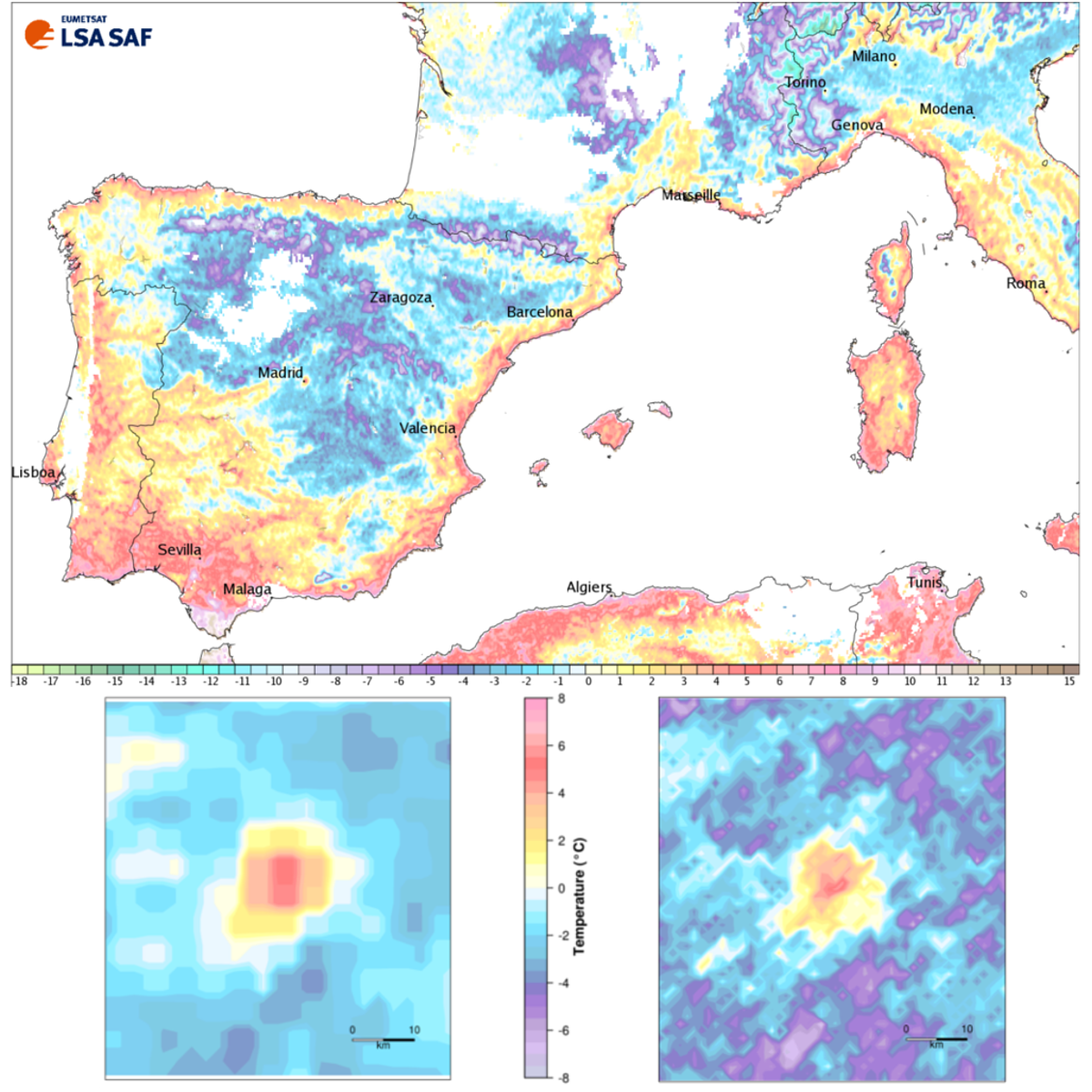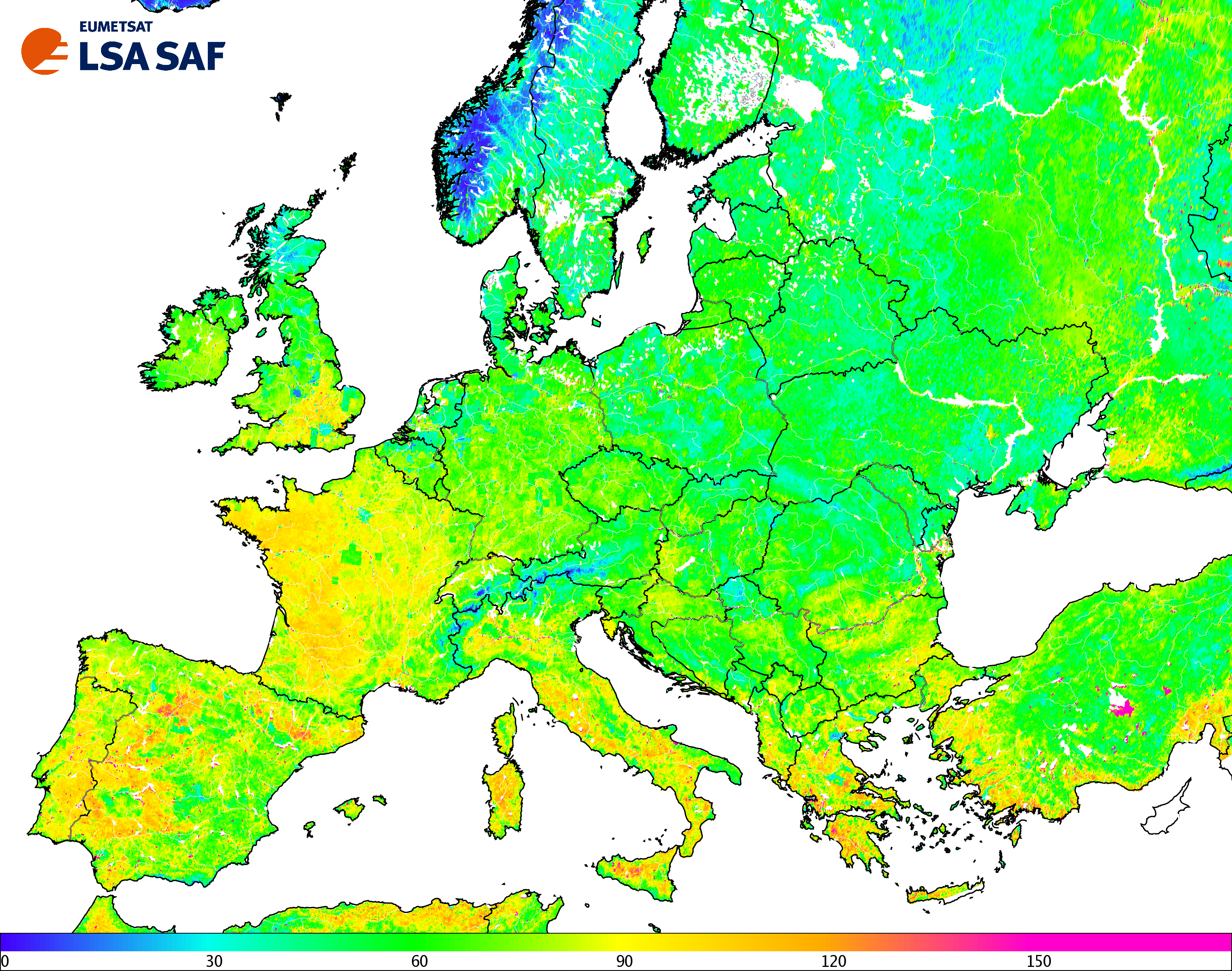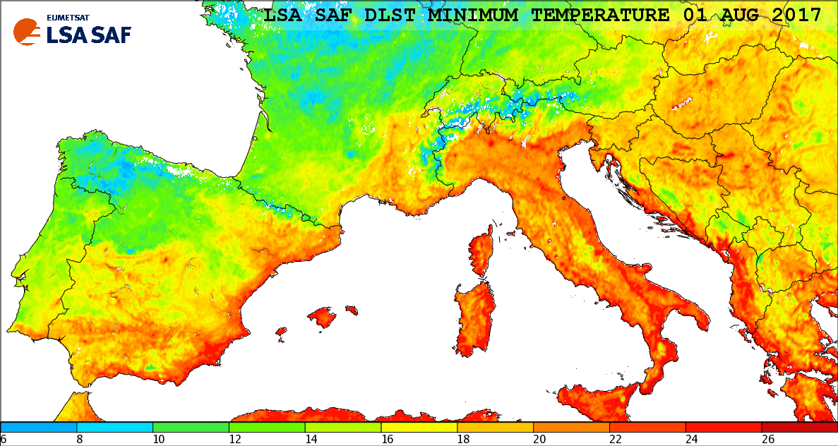 LSA SAF Derived Land Surface Temperatures (DLST; LSA-003) are obtained every ten days from all available 15 minute Meteosat LST (LSA-001) within that period. Temporal compositing and modelling of the diurnal temperature cycle results in representative and spatially continuous maps of LST, which are a very helpful indicator of past weather conditions, e.g. allowing to identify regions affected by heat waves and droughts.