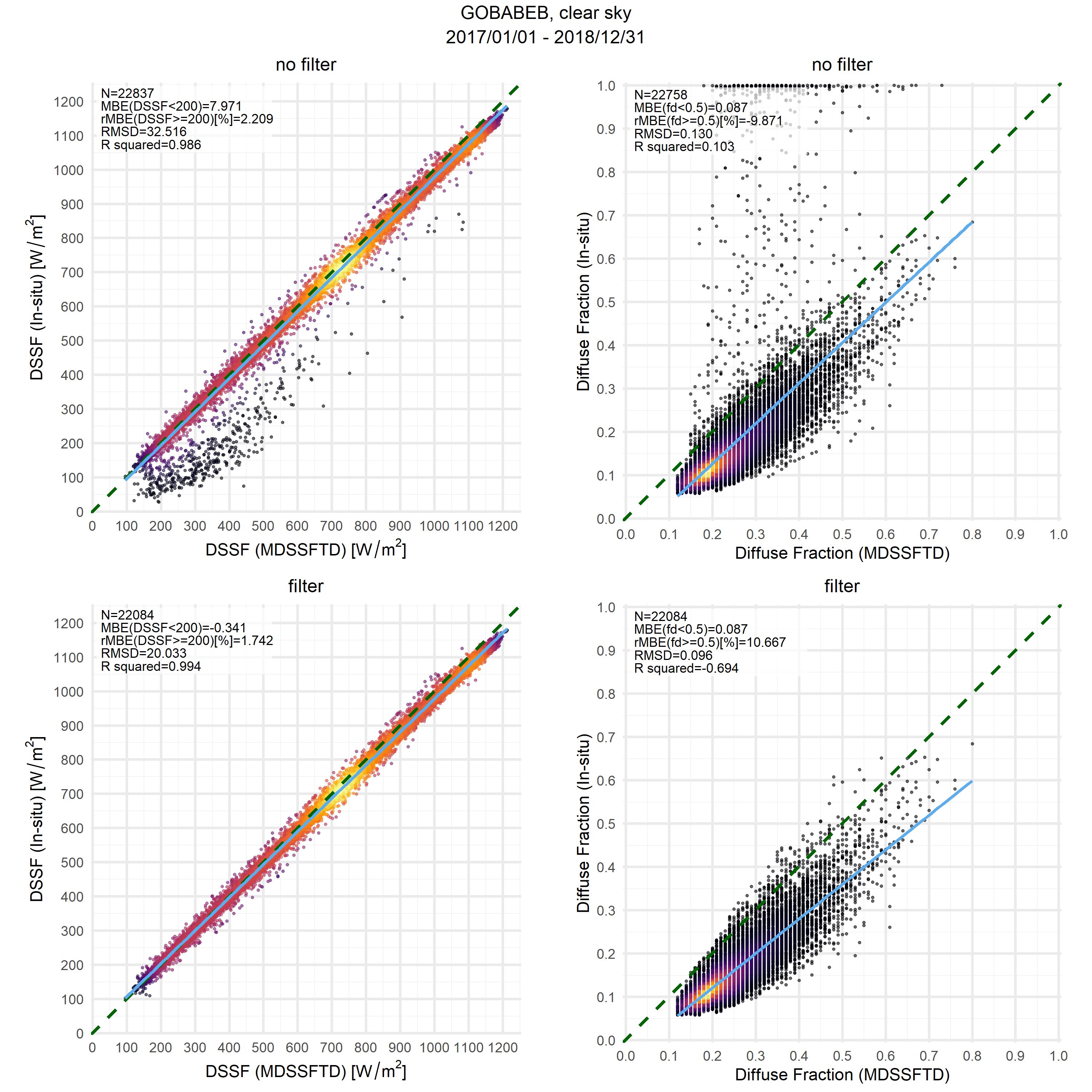 Values of incoming solar radiation are important parameters in climate and meteorological models. LSA SAF product MSG Total and Diffuse Downward Surface Shortwave Flux (MDSSFTD, LSA-207) is updated every 15 minutes and provides information of total (DSSF) and fraction of diffuse (FD) surface solar flux measurements over the MSG disk area. Additionally, it provides some auxiliary quantities - aerosol optical depth (AOD), opacity index (OI), quality flag (QF) and clearness index (Kt). Satellite data for MDSSFTD have a good agreement with ground measurements. Here we will present how a long time period comparison between station and satellite total and diffuse down-welling surface flux can provide valuable information about homogeneity of the ground measurements. We used the data for two years, 2017 - 2018.