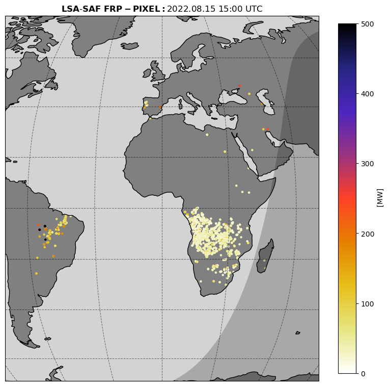 MSG FRP - Pixel | SEVIRI/ MSG | Europe, Africa, South America | 3 km | 2016-NRT | 15 min | Access Here | MSG/FRP-PIXEL | |